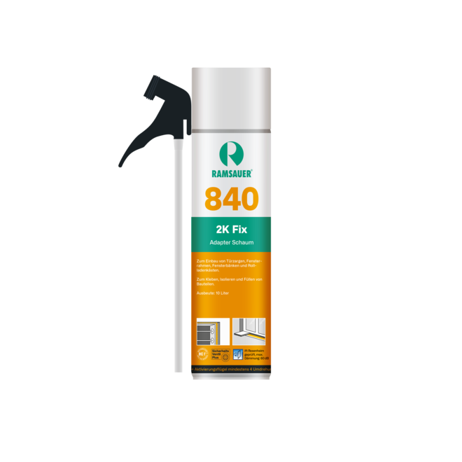 Dieser 2-Komponenten PU-Schaum spart wertvolle Zeit bei Ihrem Bauprojekt und ist besonders einfach zu verarbeiten. Unser 840 2K-FIX Schaum härtet unabhängig von der Untergrund- oder Umgebungsfeuchtigkeit aus und darf daher nicht zusätzlich angefeuchtet werden. Außerdem kann er bereits nach drei Stunden voll belastet werden. Schon nach 10 Minuten ist er schneidfähig. Die hohe Klebfestigkeit und gleichmäßige Schaumstruktur sorgen für ein optimales Ergebnis beim Verschäumen von Türzargen und Fensterelementen. Dank seiner sehr hohen Formstabilität, ist auch die Verwendung als Wannensetzschaum möglich. Im ausgehärtetem Zustand ist das Produkt sehr gut beständig gegenüber Kälte, Wärme und Wasser. Darüber hinaus ist der Schaum halbhart, elastisch und überwiegend geschlossenzellig.