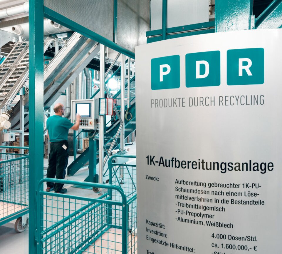 In ihrem Recyclingwerk in Thurnau betreibt die PDR eine spezielle Anlage zur Wiederverwertung gebrauchter PU-Schaumdosen. Diese weltweit einzigartige Anlage kann bis zu 4.000 Dosen in der Stunde verarbeiten. Mit modernster Technologie erreicht PDR eine Verwertungsquote von über 95 %, davon 80 % stofflich. Für PU-Schaumdosen existiert damit ein geschlossener Produktkreislauf. Die sortierten 1K-PU-Schaumdosen gelangen über ein Förderband in die Aufbereitungsanlage, wo sie zunächst unter Luftabschluss mechanisch zerkleinert werden. Die flüssigen Inhaltsstoffe sowie die Metallteile der Dosenbehälter (Aluminium bzw. Weißblech) fallen in ein Lösemittelbad. Die Metallteile werden mit einer Waschschnecke aus dem Lösemittelbad herausgefördert und mit Hilfe von Waschdüsen vorgewaschen.