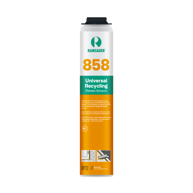 Our 858 Recycling Pistolen Schaum combines sustainability and long-term durability in one product. The foam is made with over 15% pre-polymer, which is recycled from collected polyurethane foam cans. The assembly foam offers the highest level of adhesion to all common building materials, making it ideally suited for filling recesses and openings in walls – and indeed cavities of any kind. Due to its exceptional resistance to moisture and temperature fluctuations, 858 Recycling Pistolen Schaum can also be used for loft conversions and roof insulation. The special valve makes the product easier to apply with a foam gun. And the results it delivers are a success on a visual level, too.